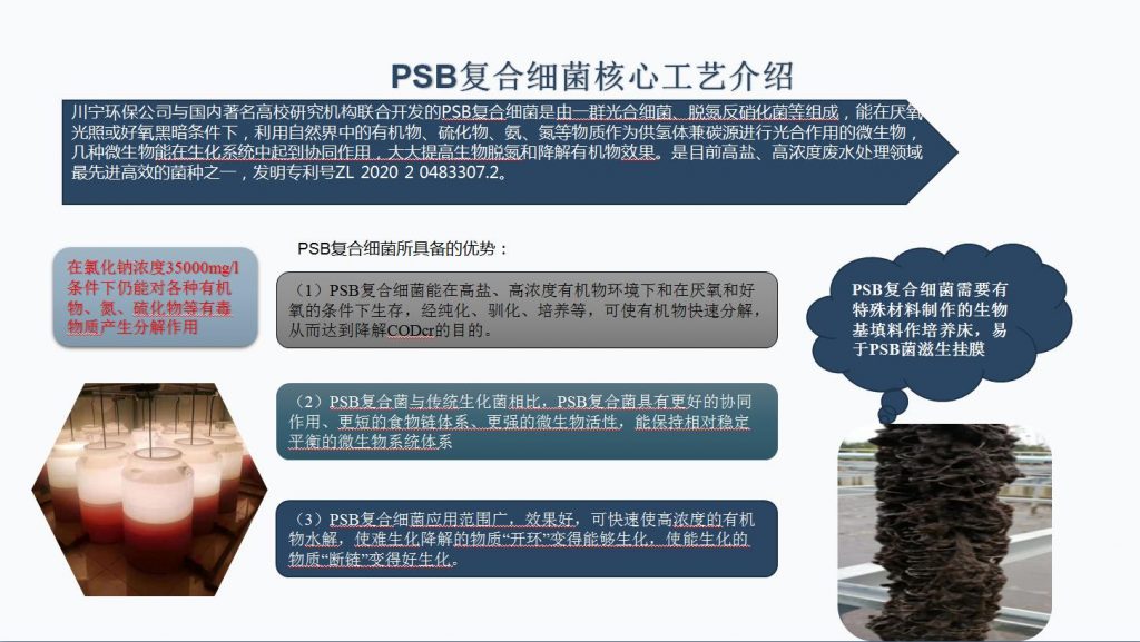 川寧環(huán)保公司與國(guó)內(nèi)著名高校研究機(jī)構(gòu)聯(lián)合開(kāi)發(fā)的PSB復(fù)合細(xì)菌是由一群光合細(xì)菌、脫氮反硝化菌等組成,能在厭氧光照或好氧黑暗條件下,利用自然界中的有機(jī)物、硫化物、氨、氮等物質(zhì)作為供氫體兼碳源進(jìn)行光合作用的微生物,幾種微生物能在生化系統(tǒng)中起到協(xié)同作用,大大提高生物脫氮和降解有機(jī)物效果。是目前高鹽、高濃度廢水處理領(lǐng)域最先進(jìn)高效的菌種之一,發(fā)明專利號(hào)ZL 2020 2 0483307.2。